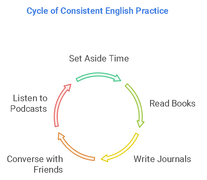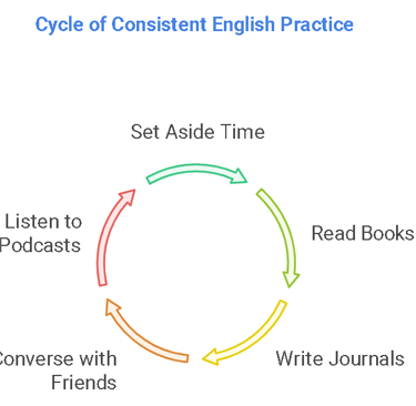 Regular practice is crucial for language acquisition. Set aside time each day to practice reading, writing, speaking, and listening in English. This could involve reading books, writing journals, conversing with friends, or listening to podcasts. Consistency helps reinforce what you've learned and builds your confidence.